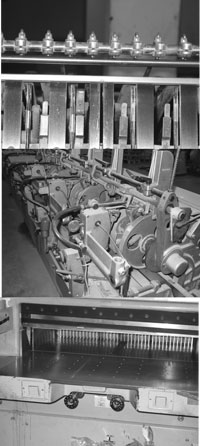 Le dos du bouquin est enduit de colle, la couverture se positionne et est envoyée automatiquement dans la relieuse. Ces machines produisent six mille volumes à l’heure. Les volumes - une fois la colle refroidie - passent sur un massicot à trois lames spécialement adapté pour couper les trois faces du volume et supprimer les débords.