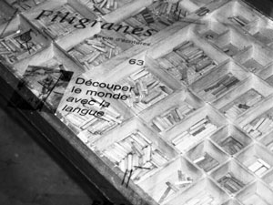 C’est le principe de l’offset : à l’endroit, à l’envers, à l’endroit. Les feuilles sont prises par des pinces et sont aspirées dans le bac de réception. Quand il y a plusieurs couleurs, on repasse à chaque fois. R. : (montrant les casiers de caractères typo) : J’en ai la nostalgie, ligne à ligne, mot à mot, lettre à lettre, les caractères sont à l’envers…