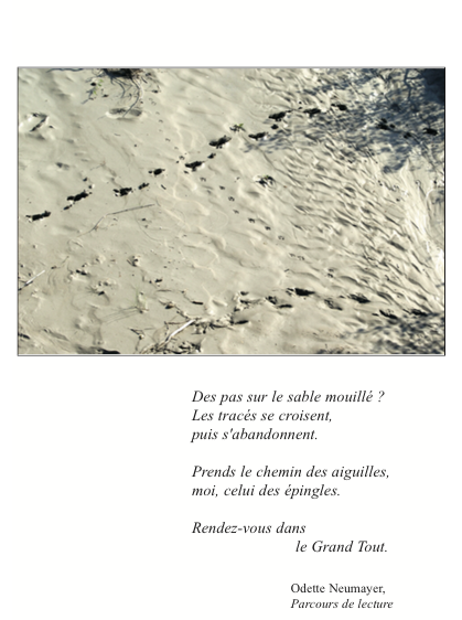 Meuglements, hennissements. Foin dans la grange, barreau /manquant. « la courte échelle, Mademoiselle ? » Souffles et / rires. Paille dans les cheveux. / Bruine et brouillard, cabans et cirés, dalles taillées dans le granit, sans garde-corps, treuils et filets, marée, criée. / Sirènes et cheminées, malles et cabines, ponts et coursives, cuivres astiqués, / cordages tendus, passerelles et coupées, escales.